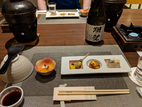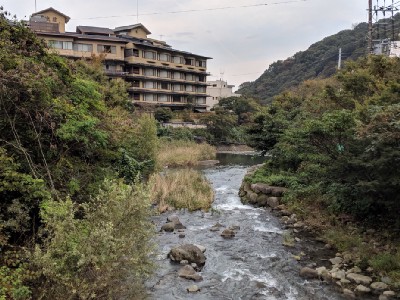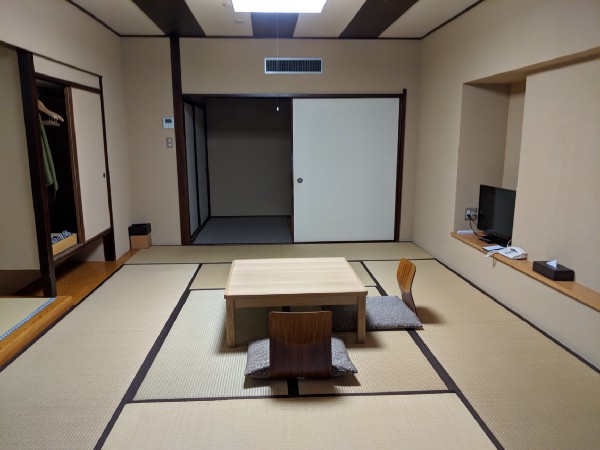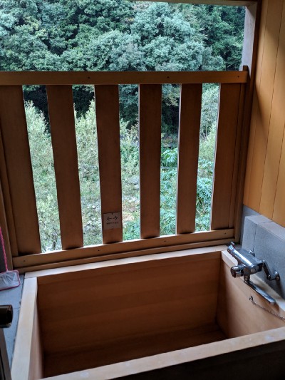 Tonight we are staying in a Ryokan, or Japanese inn. Often they have both traditional Japanese and Western style rooms. Thankfully, we got the former. The room itself is initially laid out for sitting, and will be converted to sleeping quarters later in the evening. We also had an outside bath area backing onto the river, which was pretty peaceful.
